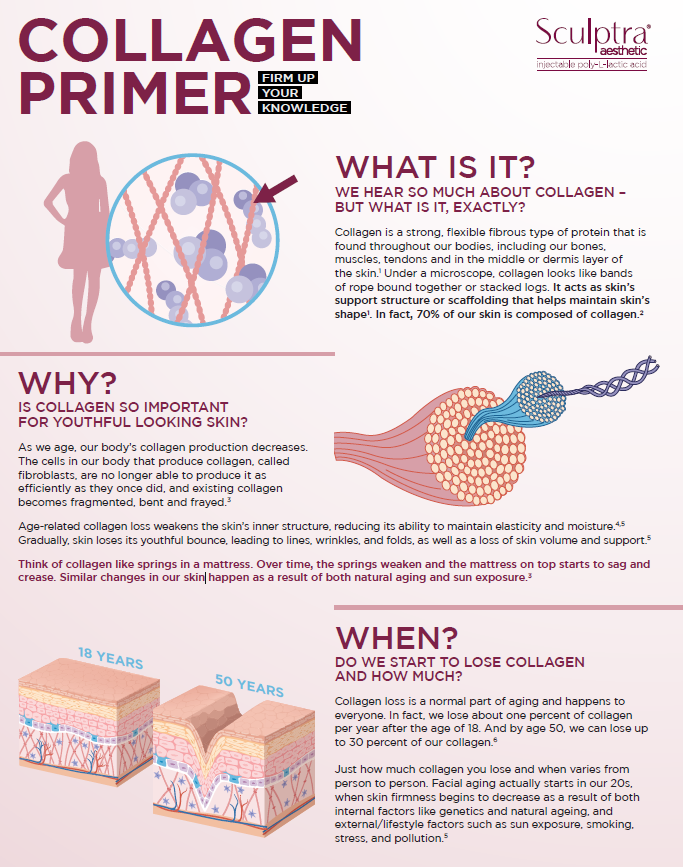 Sculptra® is a robust bio-stimulant. It aids in making you look more youthful without making you look like you have had work done. It helps to restore facial volume including wrinkles and folds in the skin. Sculptra® addresses an underlying cause of facial aging not just the symptoms. Sculptra® works with your body to help rebuild lost collagen (See the infographic below on why collagen matters). Starting between the ages of 18 and 20, we lose 1% of collagen a year. So, by the age 60 a person has lost 40% of their collagen. Anyone at any age is an ideal candidate for Sculptra® because everyone loses collagen and benefits from healthier skin. Sculptra® has also recently become popular for butt lifts, rejuvenation of arms, neck, and decolletage.